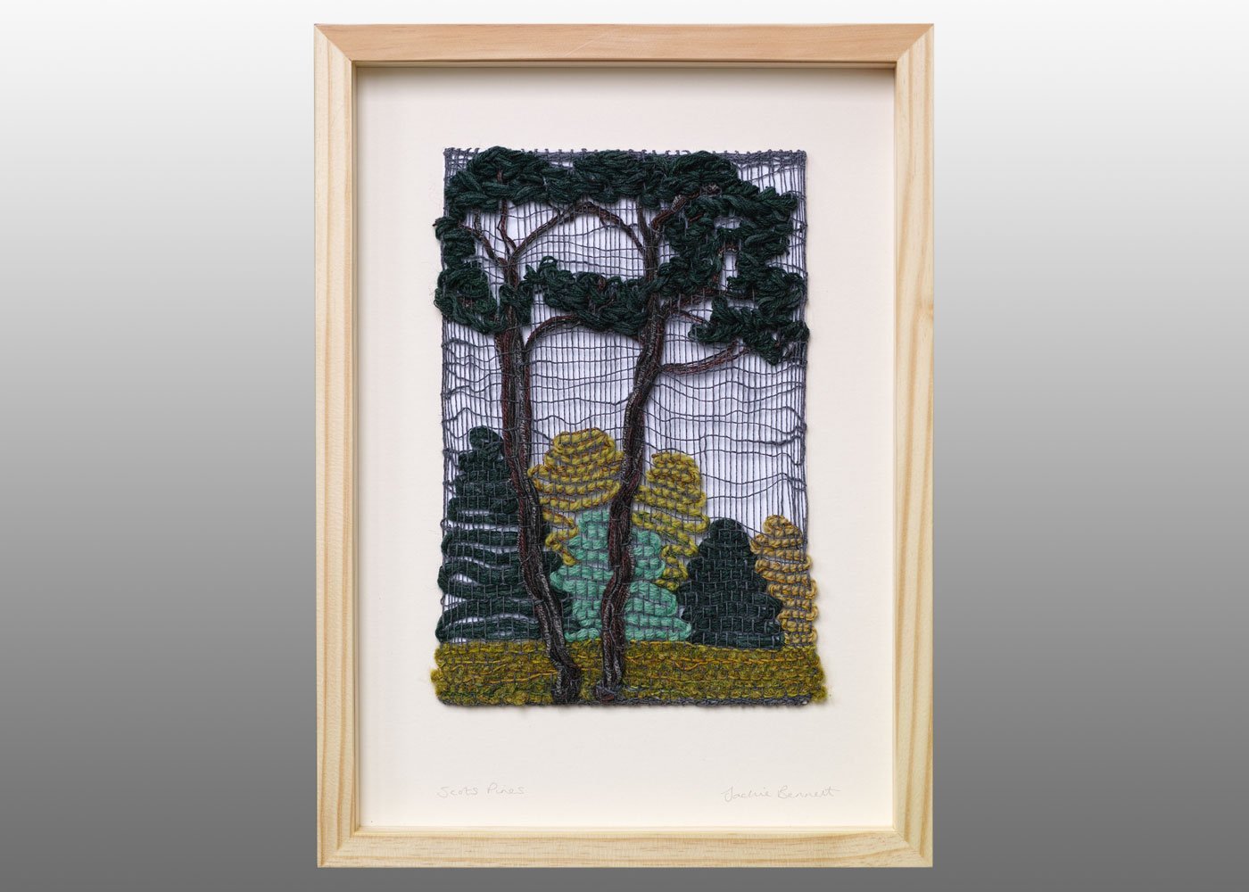Handwoven wall art of 3 tall pine trees set between lower trees with textured dark green and yellow autumnal foliage. Pale green foreground, red brick wall, open weave sky in dark grey. Mounted on acid-free board, in a wooden frame. Materials: cotton, linen, wool, silk and chenille yarns.